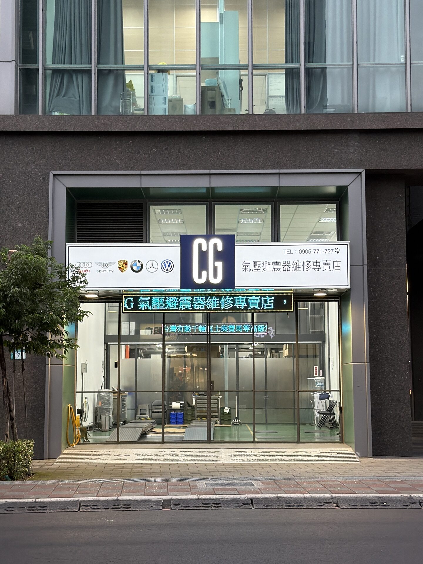 踏進 CG,你會發現這裡與過往的維修經驗完全不同。我們坐落在一棟全新玻璃帷幕商業大樓的一樓,六米挑高讓視線瞬間開闊;地面乾乾淨淨,看不見傳統維修廠常見的油汙黏膩感。所有工具整齊收在不鏽鋼工具櫃中,維修台採用高階雙層重型設備,中央空調讓工作環境與客戶等待區同樣舒適。四面六米高的採光玻璃,讓每一處細節都被陽光看得清清楚楚,這裡不是雜亂的車庫,而是一間擁有現代工業風格的精緻保養廠。